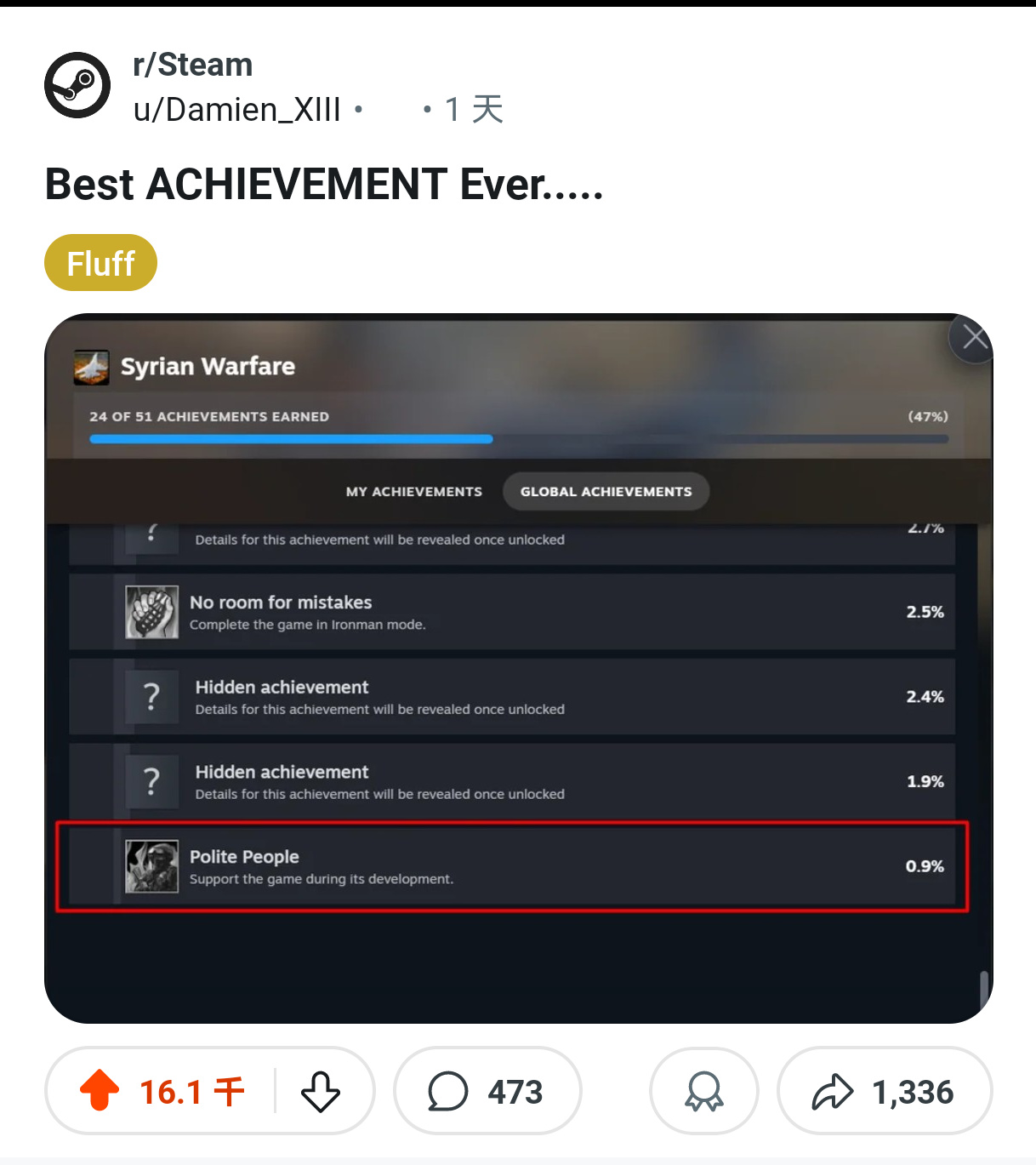 某玩家在Reddit中发帖称自己发现一个“特别有意思的成就”