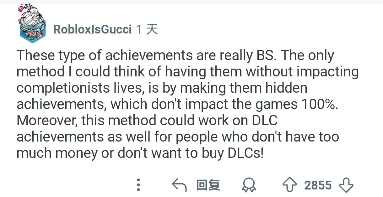 「这类成就就是恶心人!我能想到的唯一解决办法是把它们设成隐藏成就——这样既不影响成就完成党追求100%完成率,又不会恶心人。而且这套逻辑同样适用于DLC成就:买不起DLC或者不想买的玩家就不用被残缺的成就列表折磨了!」
