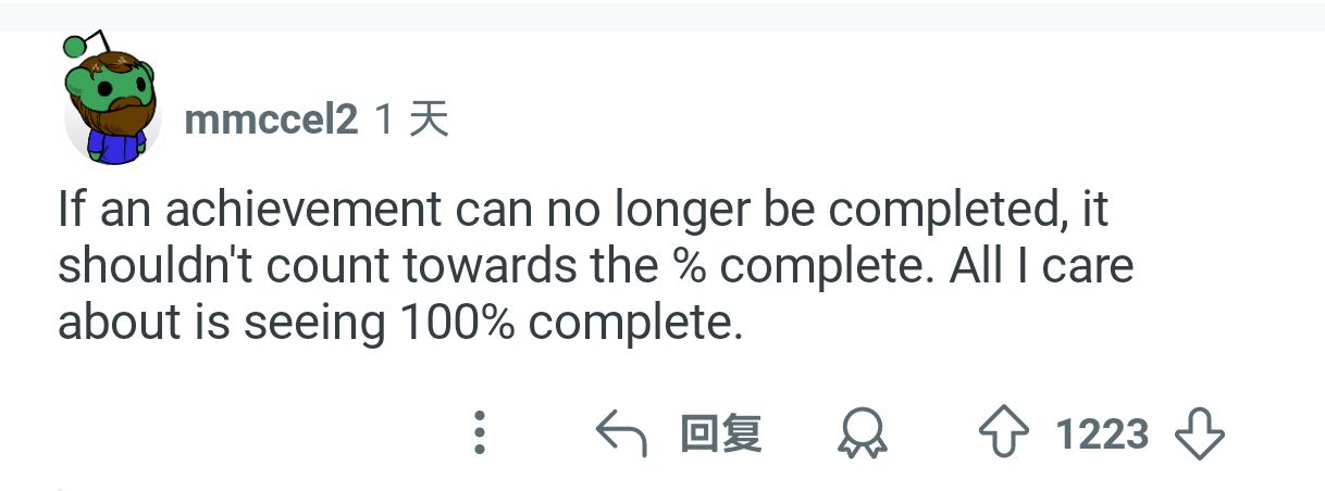 「如果某个成就已无法完成,它根本就不该计入总完成度!我唯一的诉求就是能看到100%完成的完美页面」