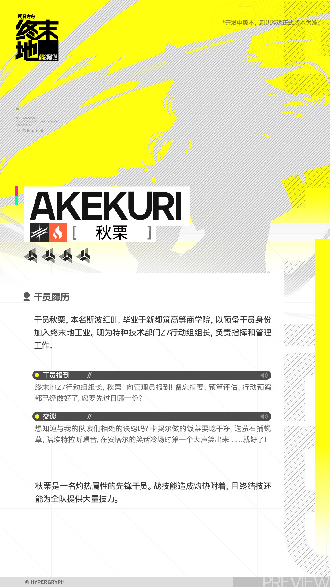 “秋慄”是一名灼熱屬性的先鋒幹員。戰技能造成灼熱附着,且終結技還能爲全隊提供大量技力。