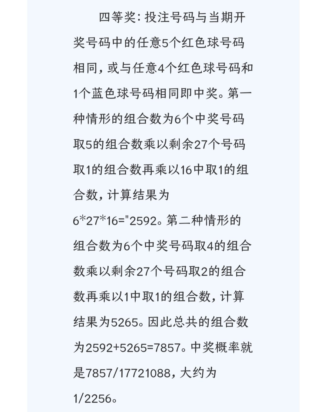 然後是和現實生活相關的概率,根據互聯網統計信息查詢,雙色球四等獎的概率大概爲0.044%(萬分之4.4),獎金約爲200元
