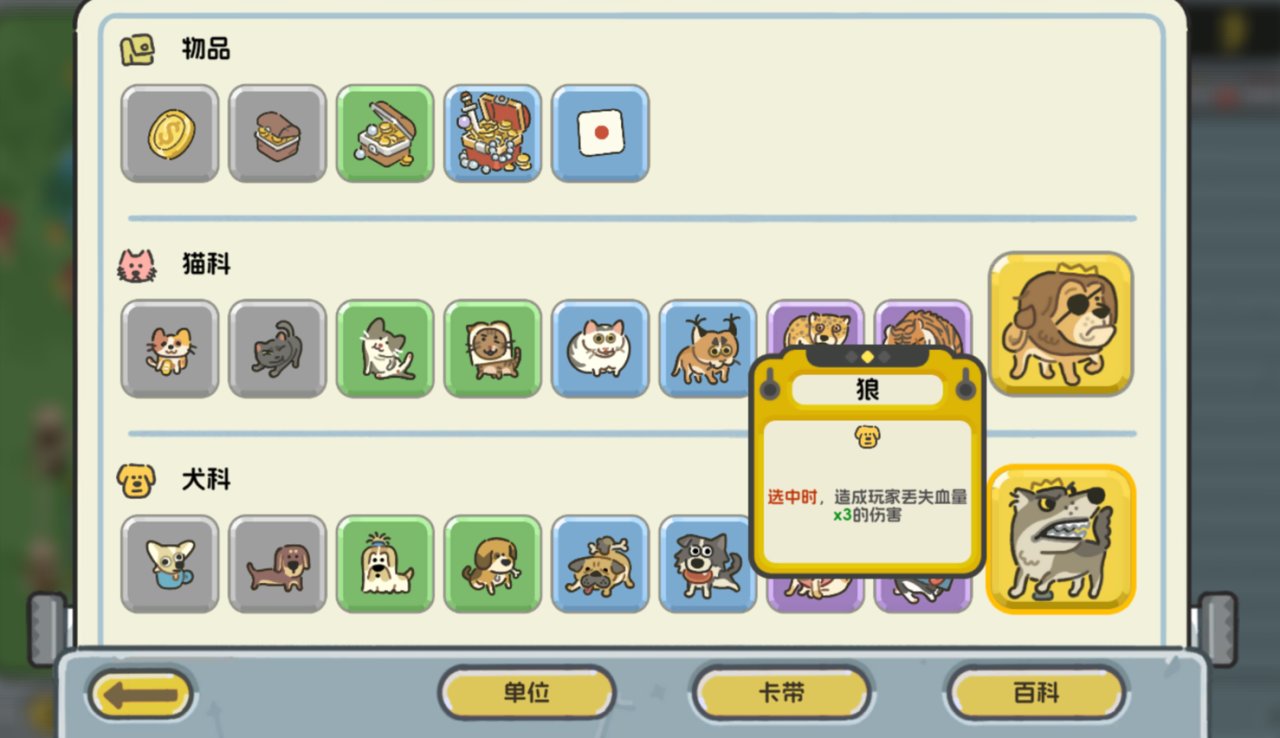 每一个动物朋友都有自己的流派,动物是有13个种族之分的,比如物品(非动物)、猫科、犬科、鸟、幻想、有蹄、鱼、机械等等,只要选到了动物,它们就会帮助你对敌人进行攻击。