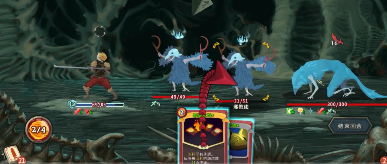 但是别忘了,我们面前有一个敌人,每次回合结束它都会自动攻击我们,而且它的攻击力还会随着回合逐渐增长越打越痛,哪怕是开局只有3点的攻击的小杂兵,也会随着回合数的增加变成一拳好几千的大boss。