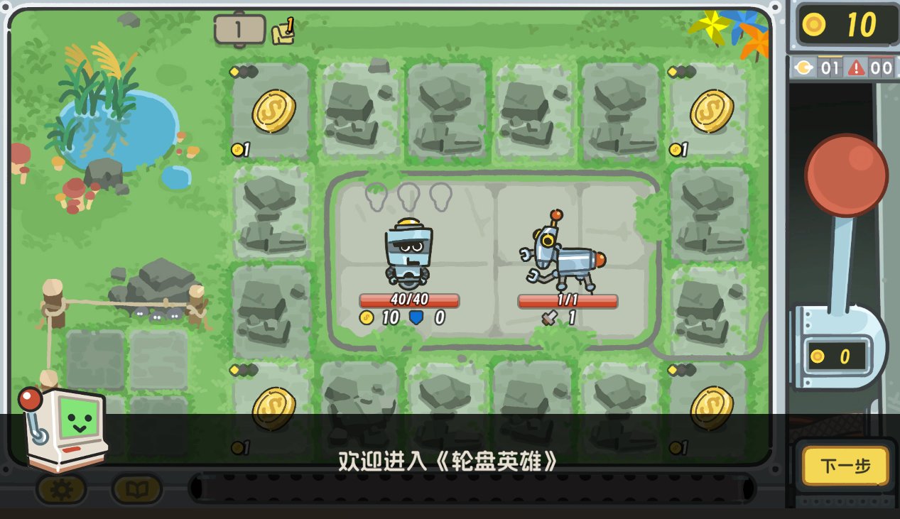 和《小丑牌》一样,《轮盘英雄》基本上没有任何的剧情,就是纯纯的战斗爽,刚一打开游戏就会蹦出来一个机器人,教你怎么去拉动屏幕右侧的拉杆进行旋转。