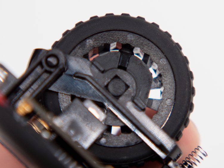滚轮依旧沿用24段光栅滚轮,确认感和紧实度要一众编码器滚轮好的多。但重量和体积都远不如编码器,因为太占内部空间所以现在几乎没什么厂商还在用。