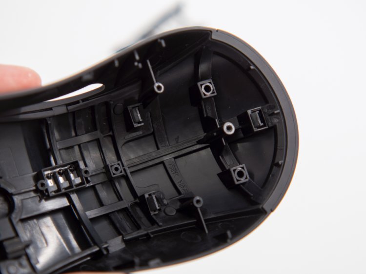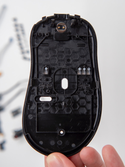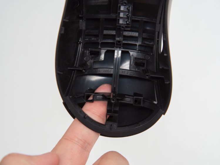 底部按键采用热熔固定,在底壳上可以看到一些减重痕迹,但没有像其他厂商那样挖空。