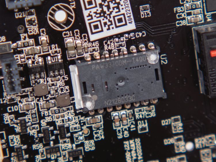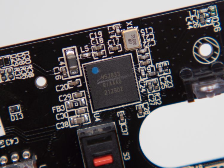 主板上共有两颗可见IC,分别是无线IC:nRF52833和鼠标传感器PAW3370。