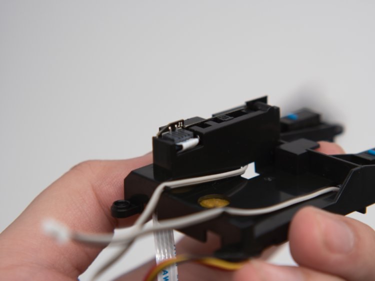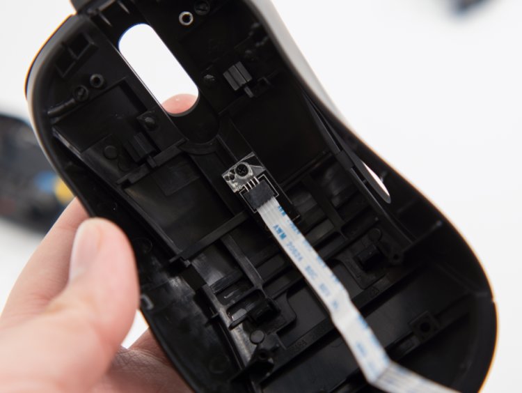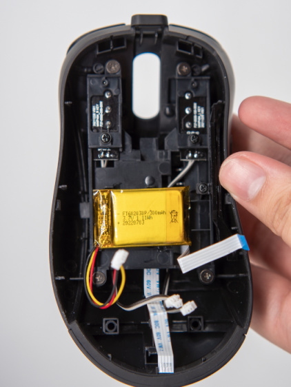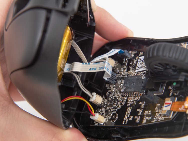 打开后映入眼帘的就是这宛如「盘丝洞」一样的布线,左右键和侧键小板及顶部指示灯都有单独的排线连接到主板上。