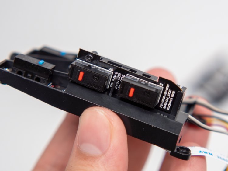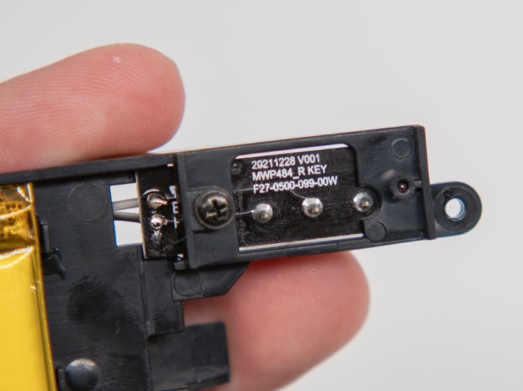 这次无线EC将微动和侧键都固定在一块单独的中框上,再通过排线和主板连接,这也是「盘丝洞」形成的原因。