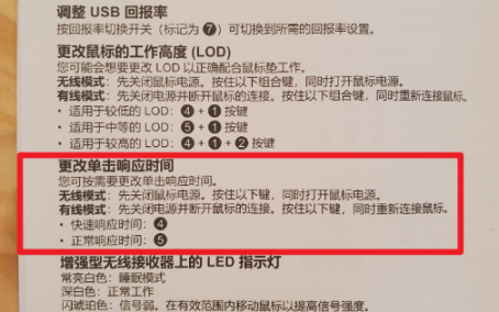 但你要这么说,我可就得给卓威「洗」一下了。在鼠标的说明书里清楚的写着卓威这次提供了两档点击延迟调节,分别是4Ms和8Ms。实测数据中的4Ms并不是卓威无线问题,反而还是卓威特地调校出来的结果。
