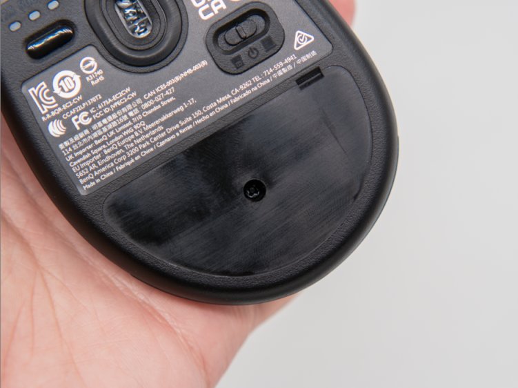 撕开脚贴可以看到鼠标底部仅有一颗螺丝固定,拧下落式后沿着两边撬开就能打开鼠标。