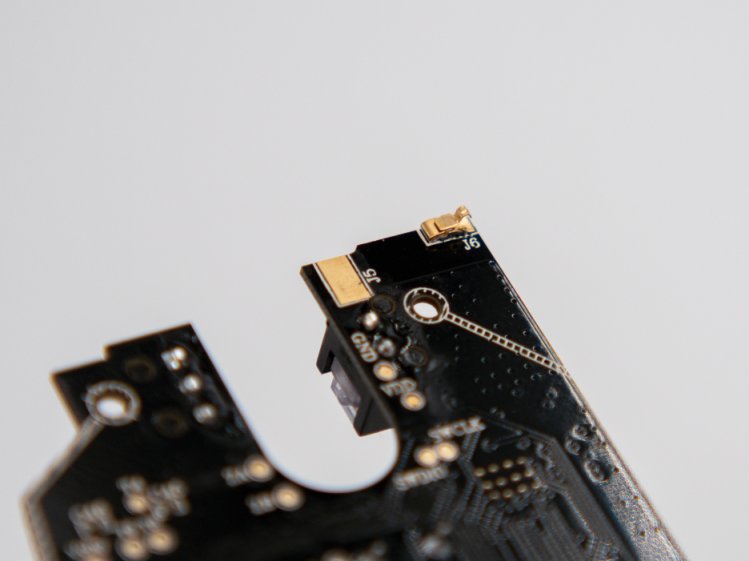 可以看到因为滚轮和独立天线原因,鼠标PCB前半部分已经没有空间再将微动集成在主板上。