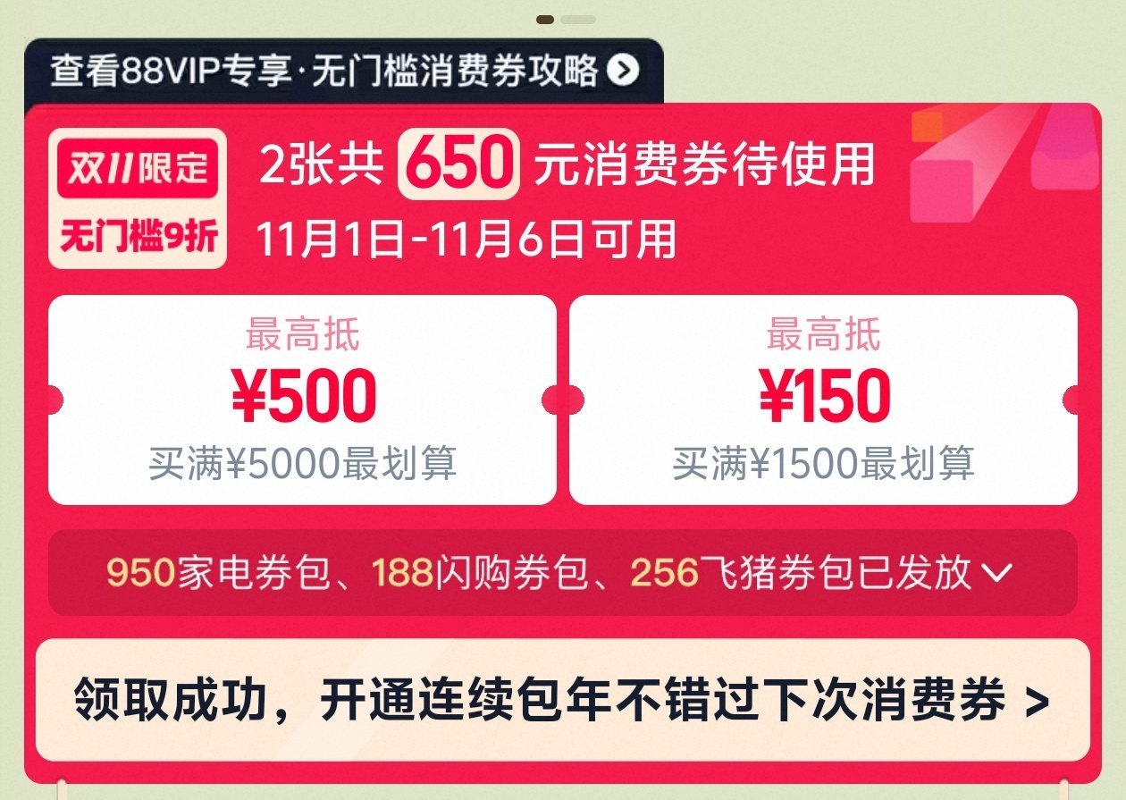 88VIP开通后每个月8号和18号或者大型的购物节都会发放9折优惠券