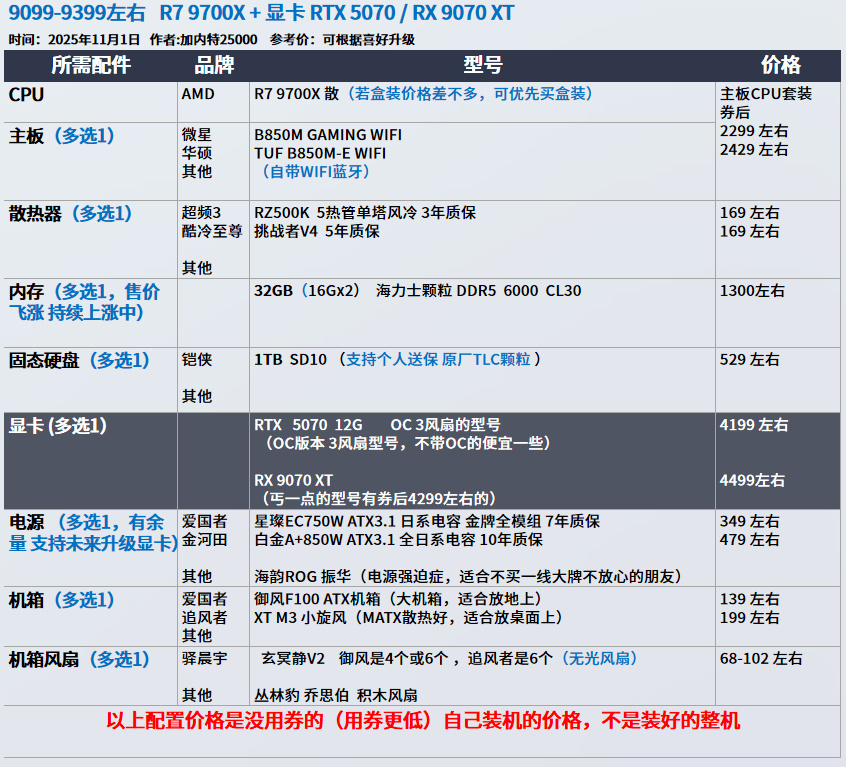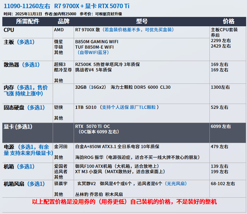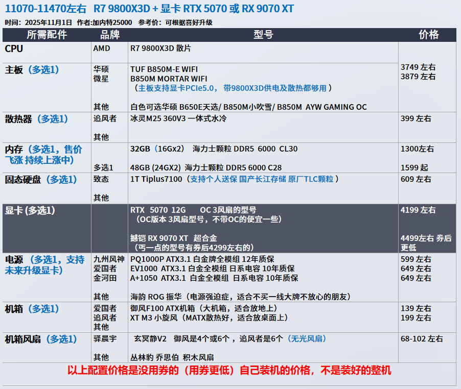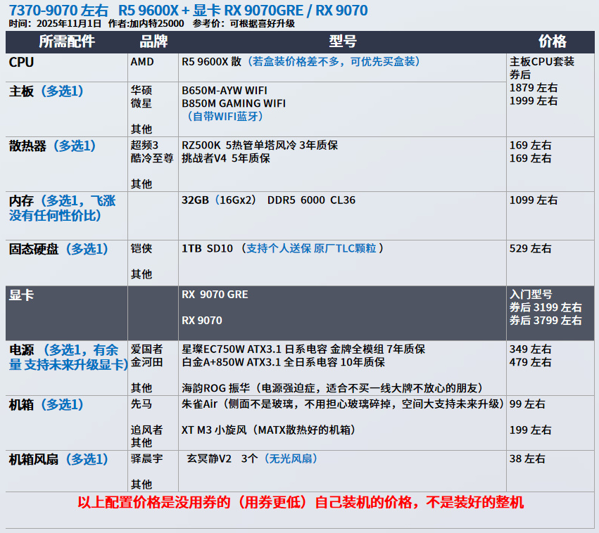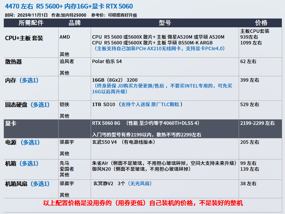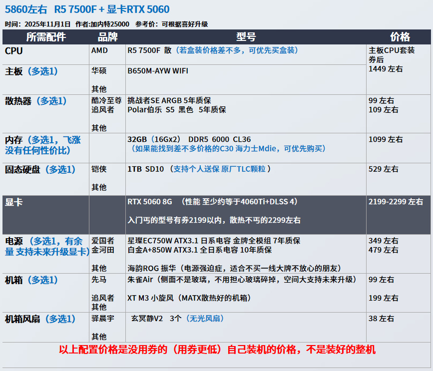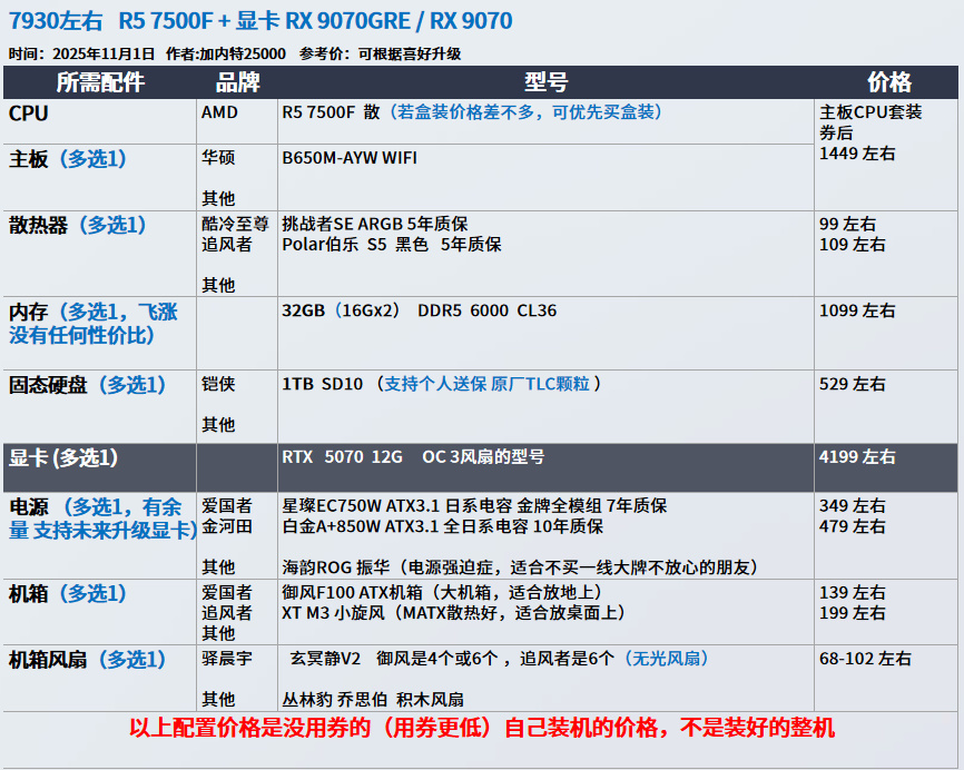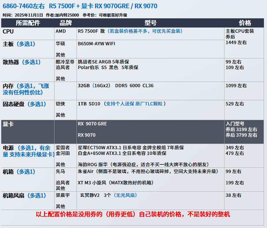3套配置,预算有限好像只适合D4内存的配置?内存D5 6000C36已经比R5 7500F贵很多了,快追上主板CPU套装了....电源都留有余量,未来可升级高性能显卡