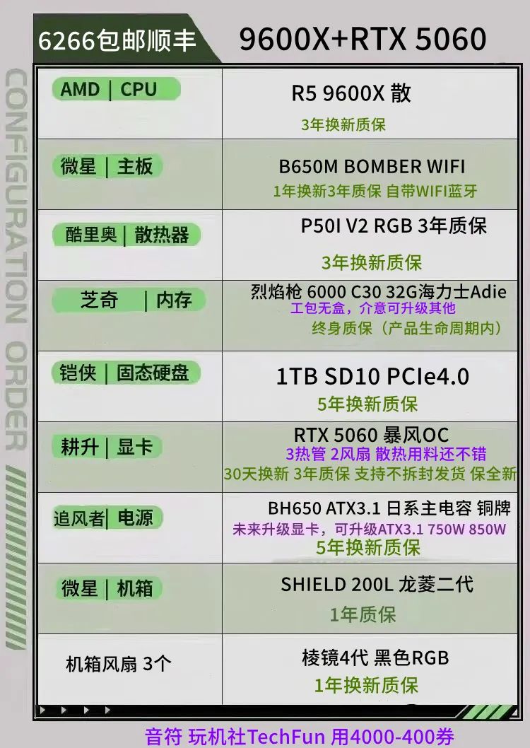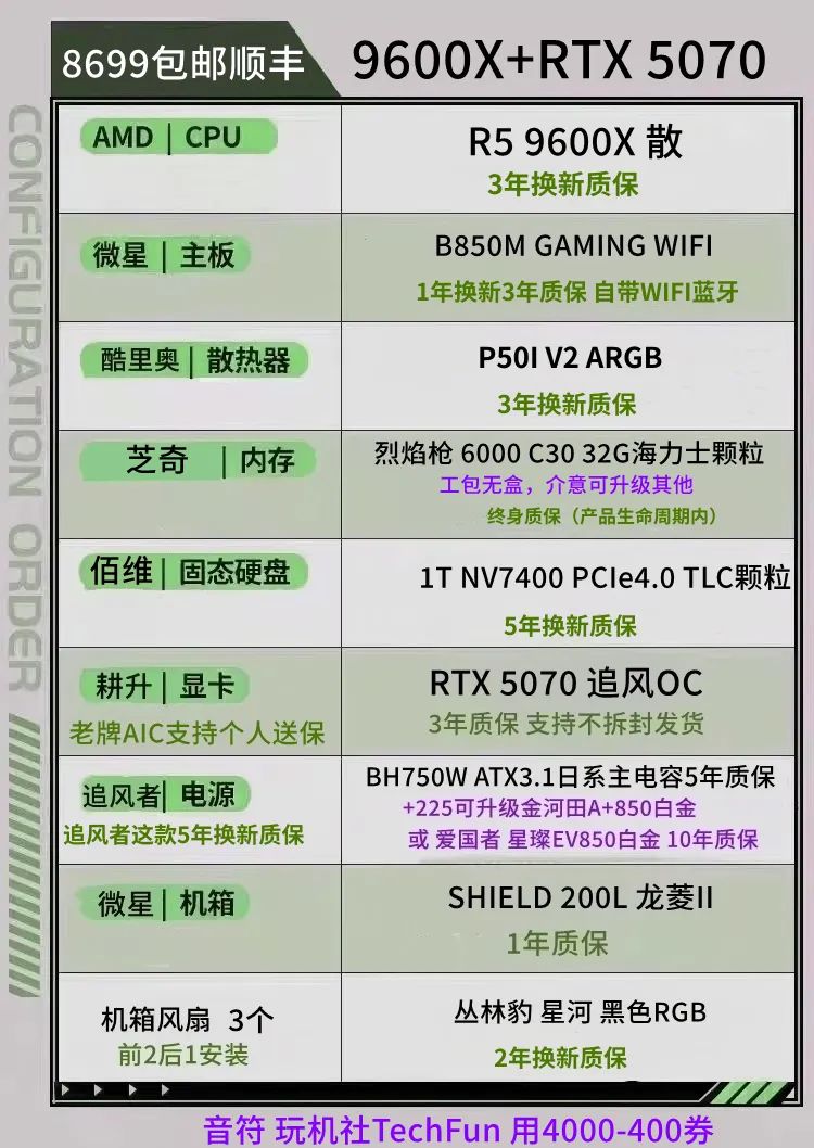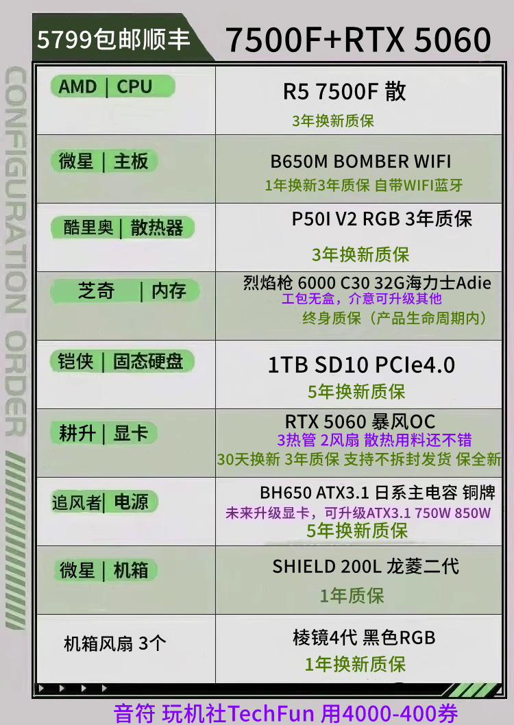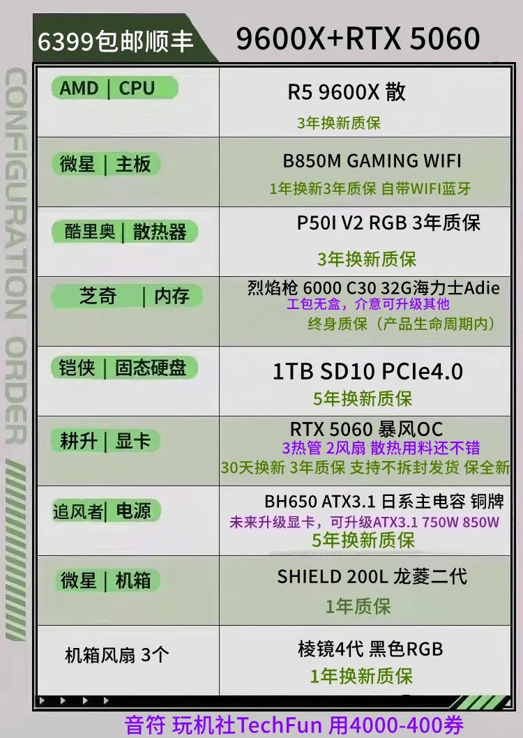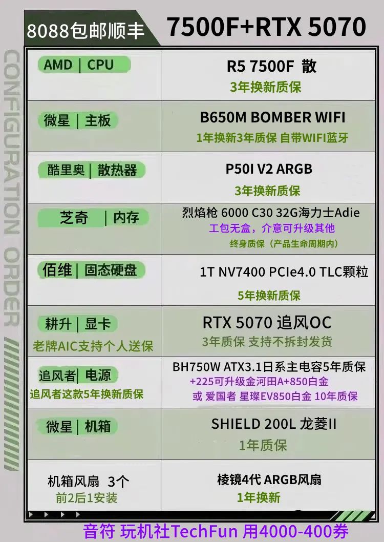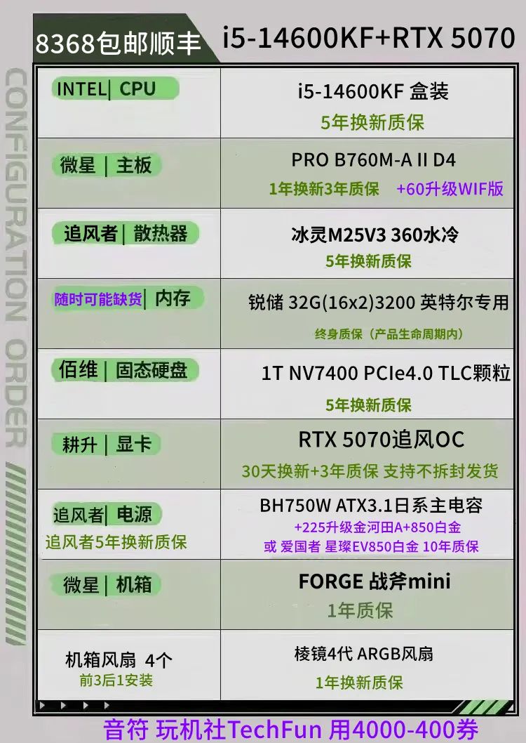 3套配置,预算有限好像只适合D4内存的配置?内存D5 6000C36已经比R5 7500F贵很多了,快追上主板CPU套装了....电源都留有余量,未来可升级高性能显卡