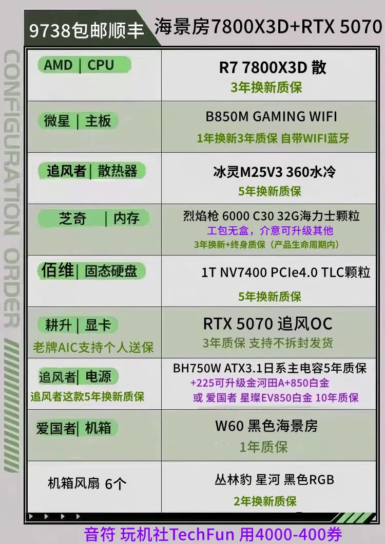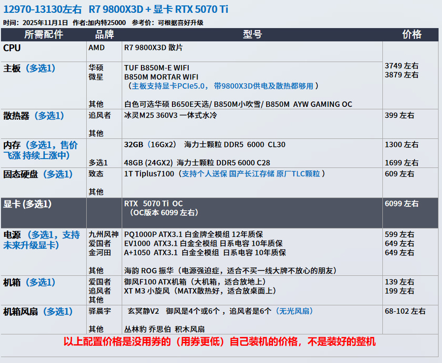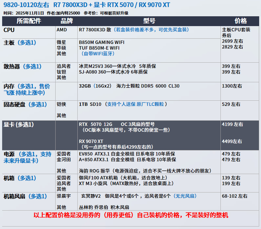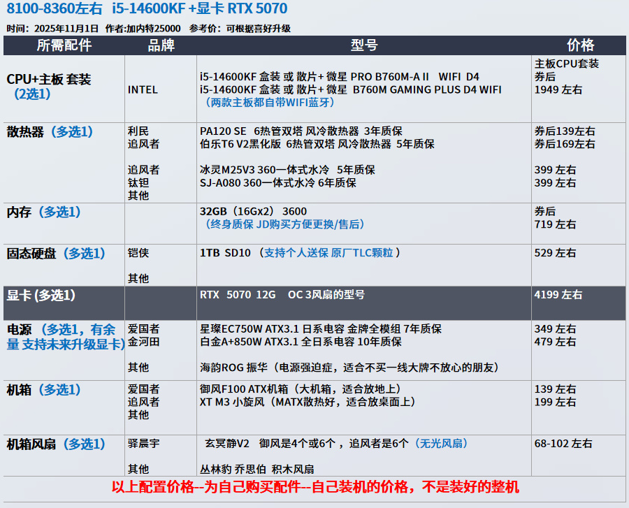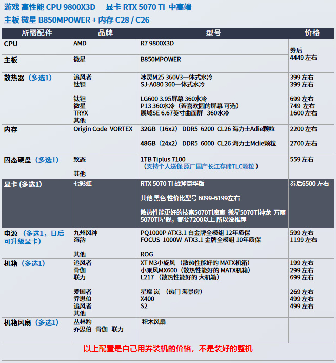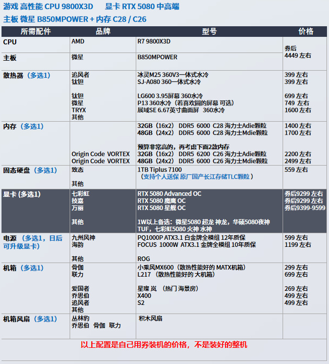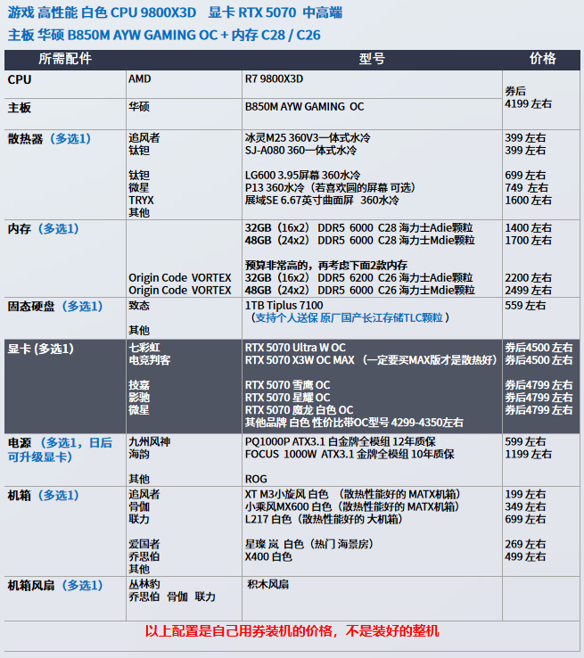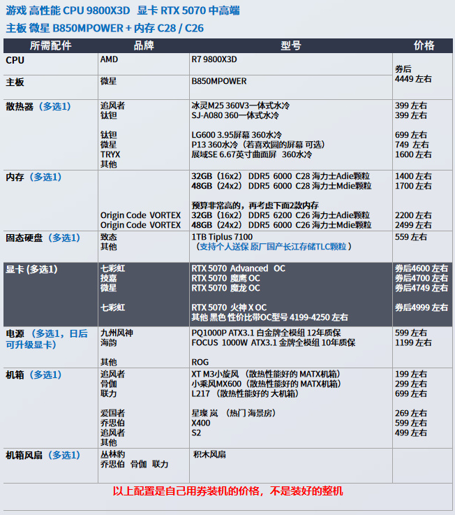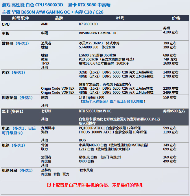 配置分享为纯主观,配件仅供基础参考,大家可在表格接触上进行升级调整,选择自己喜欢的配件。