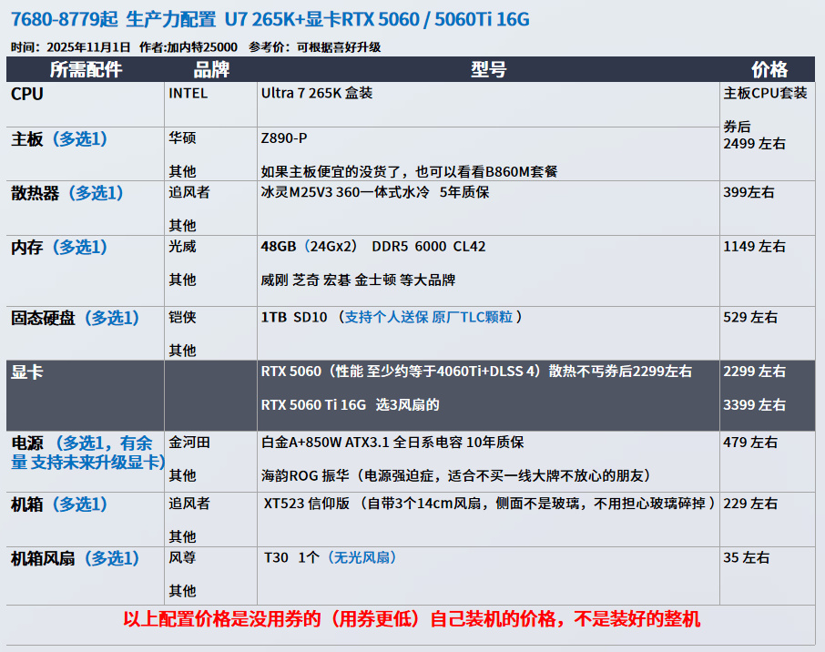 最后是生产力配置,适合对CPU 内存 主板拓展有高要求,对显卡要求不高的选择