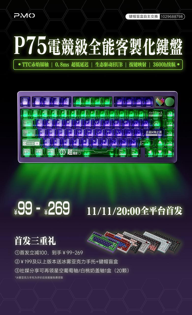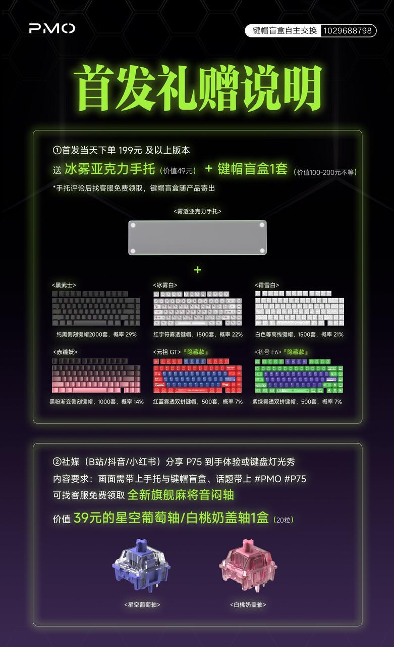 首发199元以上版本,联系客服,送冰雾亚克力手托节+键帽盲盒,社媒分享还送轴体。