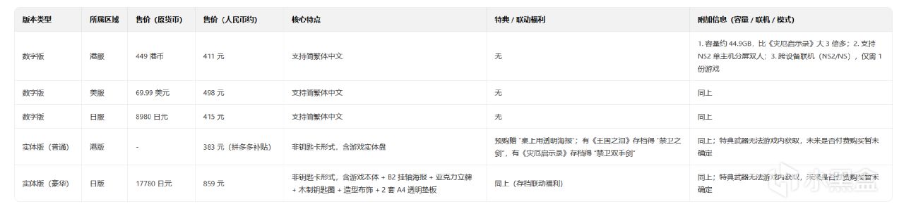 关于游戏版本和售价的信息,我也做了张表格,大家有需要可以自己保存。