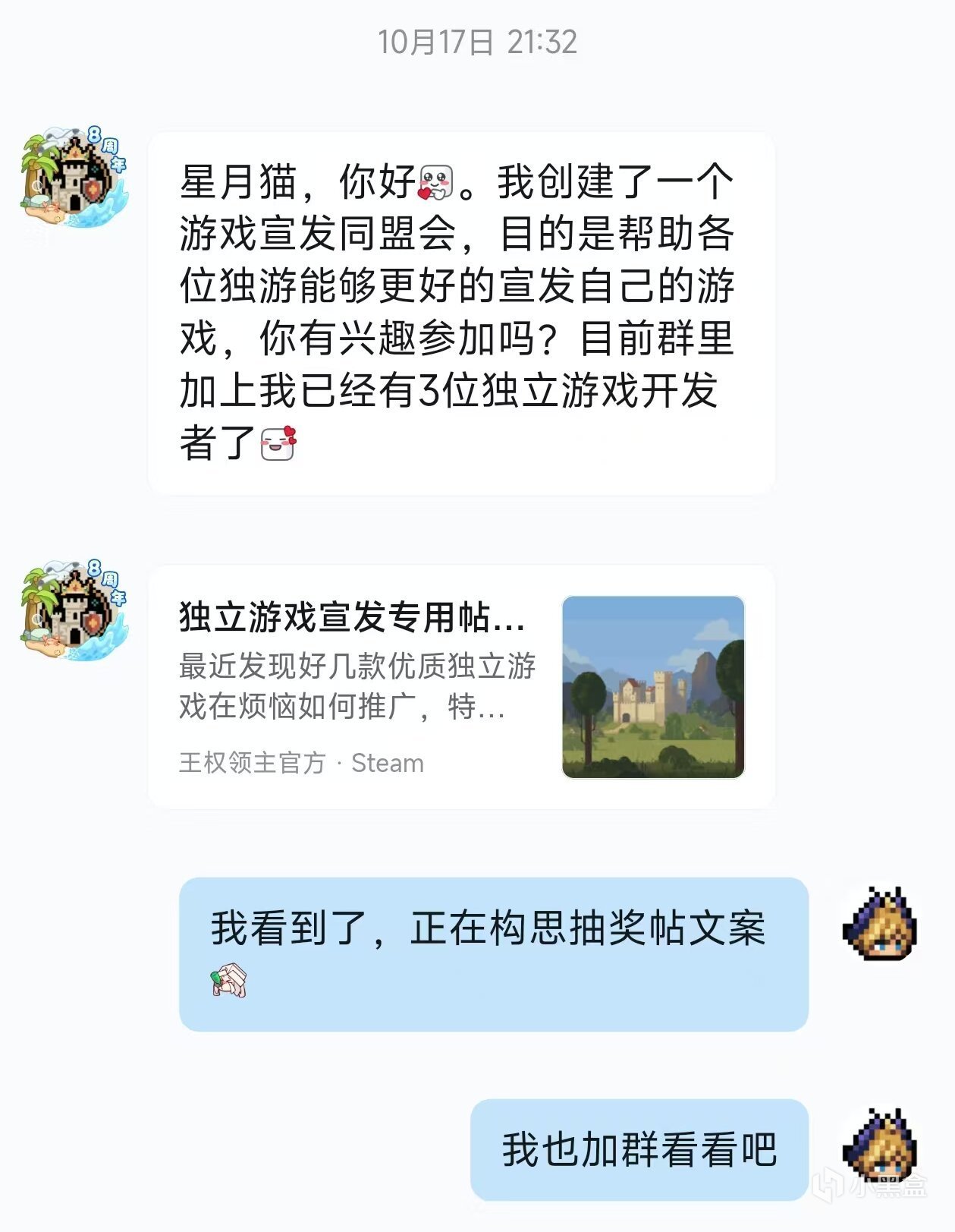 新品節期間,我們的願望單增長得很慢。每天盯着數據,心裏越來越沒底。就在那時,一位偶然刷到我帖子的獨立遊戲開發者,邀請我加入一個叫“獨遊宣發同盟”的小羣。