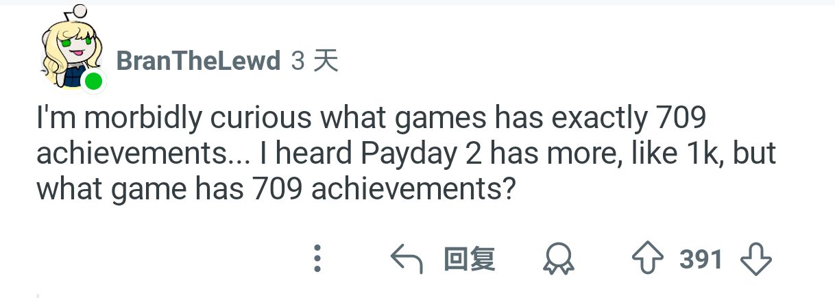 「我真是病态地好奇,到底啥游戏正好有709个成就……我听说《收获日2》的成就更多,都快1000个了。但到底哪款游戏有709个成就呢?」