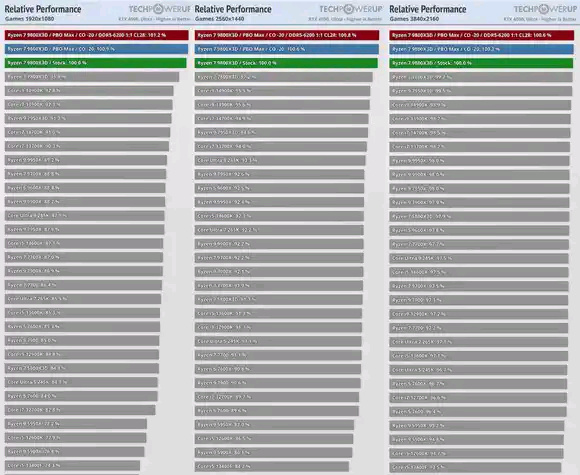 从左到右依次是1080P/2K/4K分辨率下,CPU游戏性能排名,测试显卡均为5090,目前最强游戏U为9800X3D。