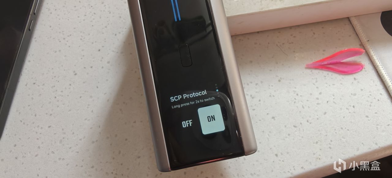 这次的显示屏是一个重点,方便我们查看各种信息和功能开关。最基础的充电宝剩余电量,充电功率、电流和电压一应俱全。我们甚至还可以控制屏幕本体是否常亮,还有就是充电协议的开关。