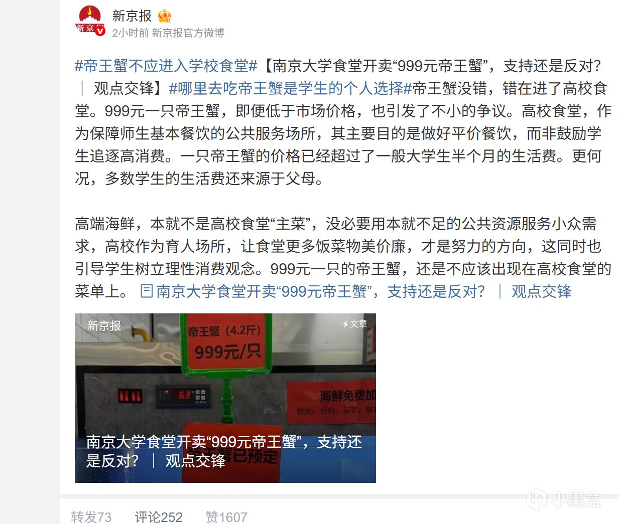 近日,江苏南京,南京大学仙林校区食堂以999元单只的价格上架帝王蟹,并面向学生售卖。有学生为学校点赞,也有网友质疑,高校食堂提供这种高价菜品是否合适。