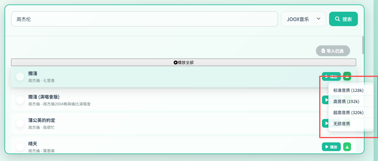 右上角能开启黑暗模式,页面中间是歌曲、歌手和专辑的输入框。右边可以切换好几种解析源,有网易、酷我,还有个 JOOX ,最后这个 JOOX 不太清楚是啥,估计是整合源。