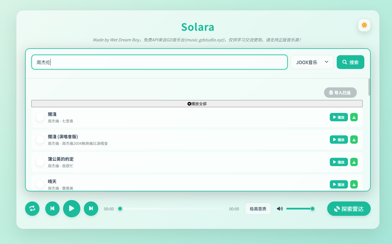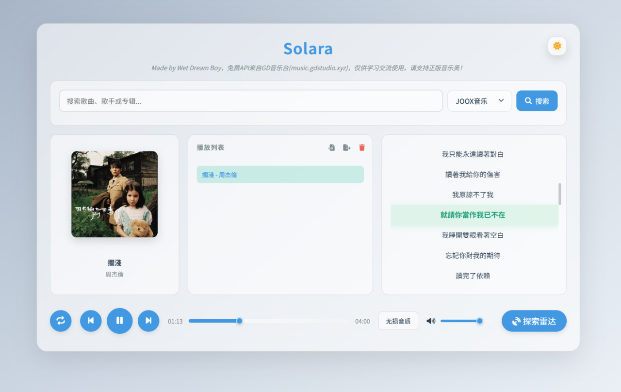 主页清新,支持多解析源切换。可播放、下载(含无损),在线播放观感佳,带探索雷达功能。非常不错的项目,不过切记项目仅供学习交流。