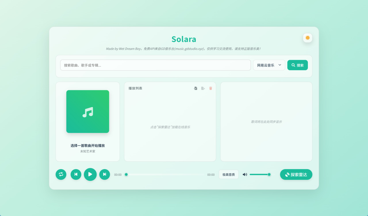 还真发现个新鲜项目,Docker 版本的 Solara 。这玩意儿你就可以理解成一个既能在线播放又能下载的音乐播放器,而且 UI 界面还挺不错。项目代码轻量化,又有内置解析,特别适合临时用来找音乐、下载音乐。开源地址是 https://github.com/xiaosahuogui/Solara-docker,发布还不到一周。