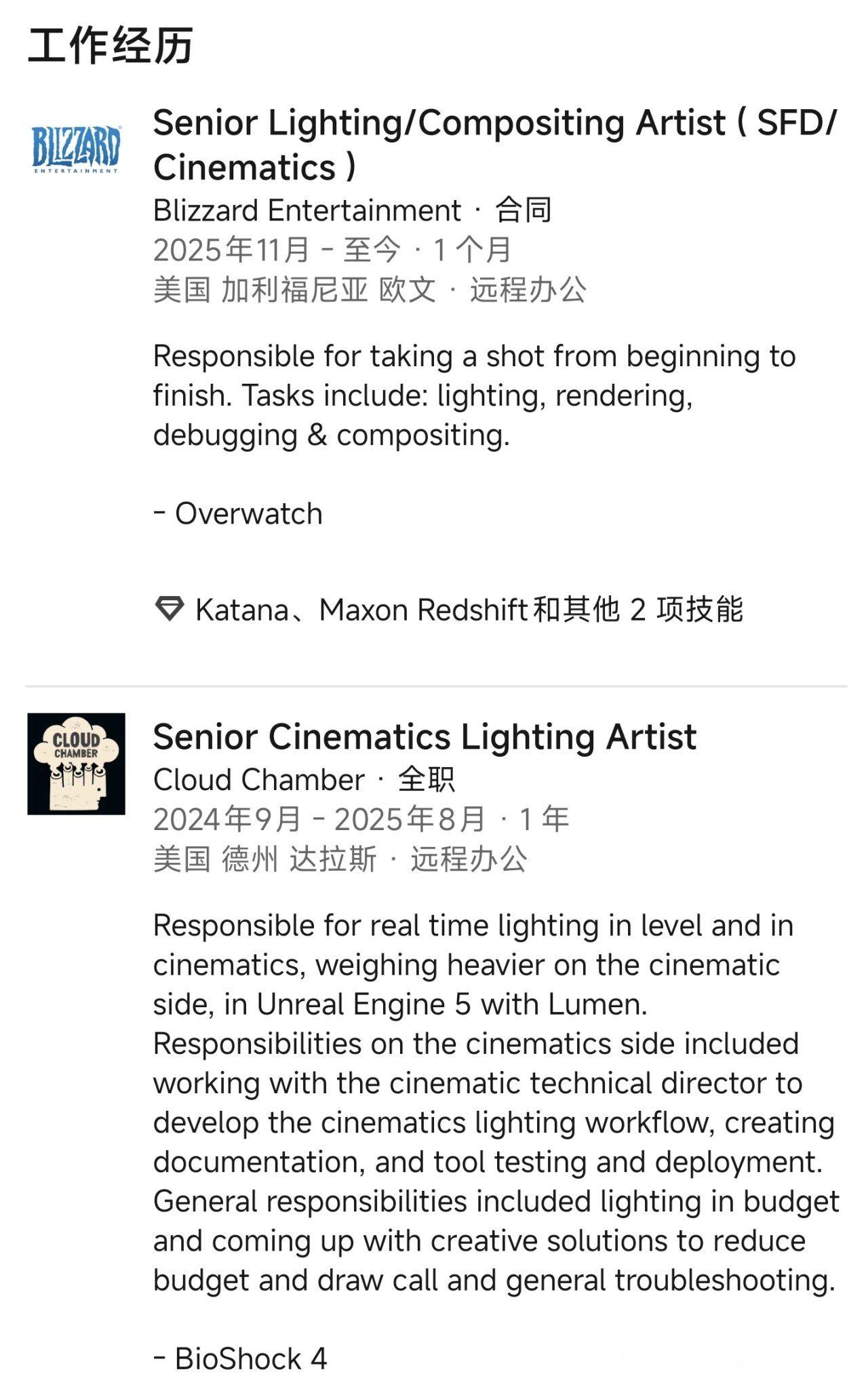 暴雪招募新高级灯光/合成美术师Doris Wang,负责镜头从开始到完成的全部流程,任务包括:灯光、渲染、调试及合成。