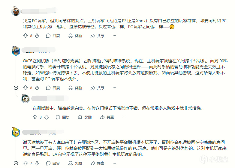 雖然有些玩家認爲手柄和鼠標之間的差異更多地取決於技術而不是硬件,但大多數人認爲在《戰地6》中, 輔助瞄準並不能彌補鼠標的精準度不足,導致比賽不平衡。