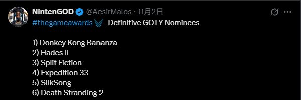 玩家提名名单中,《死亡搁浅2》与《空洞骑士:丝之歌》成为最大热门。前者凭借小岛秀夫独特的艺术表达备受期待,后者则承载了独立游戏爱好者多年的期盼。同时,《光与影:33号远征队》作为今年表现惊艳的黑马,也被视为年度游戏的有力竞争者。此外,《天国:拯救2》《羊蹄山之魂》及任天堂的《咚奇刚:蕉力全开》等作品也拥有大量支持者。这些游戏涵盖了从写实RPG到平台跳跃的多种类型,展现了2025年游戏市场的多元与活力。