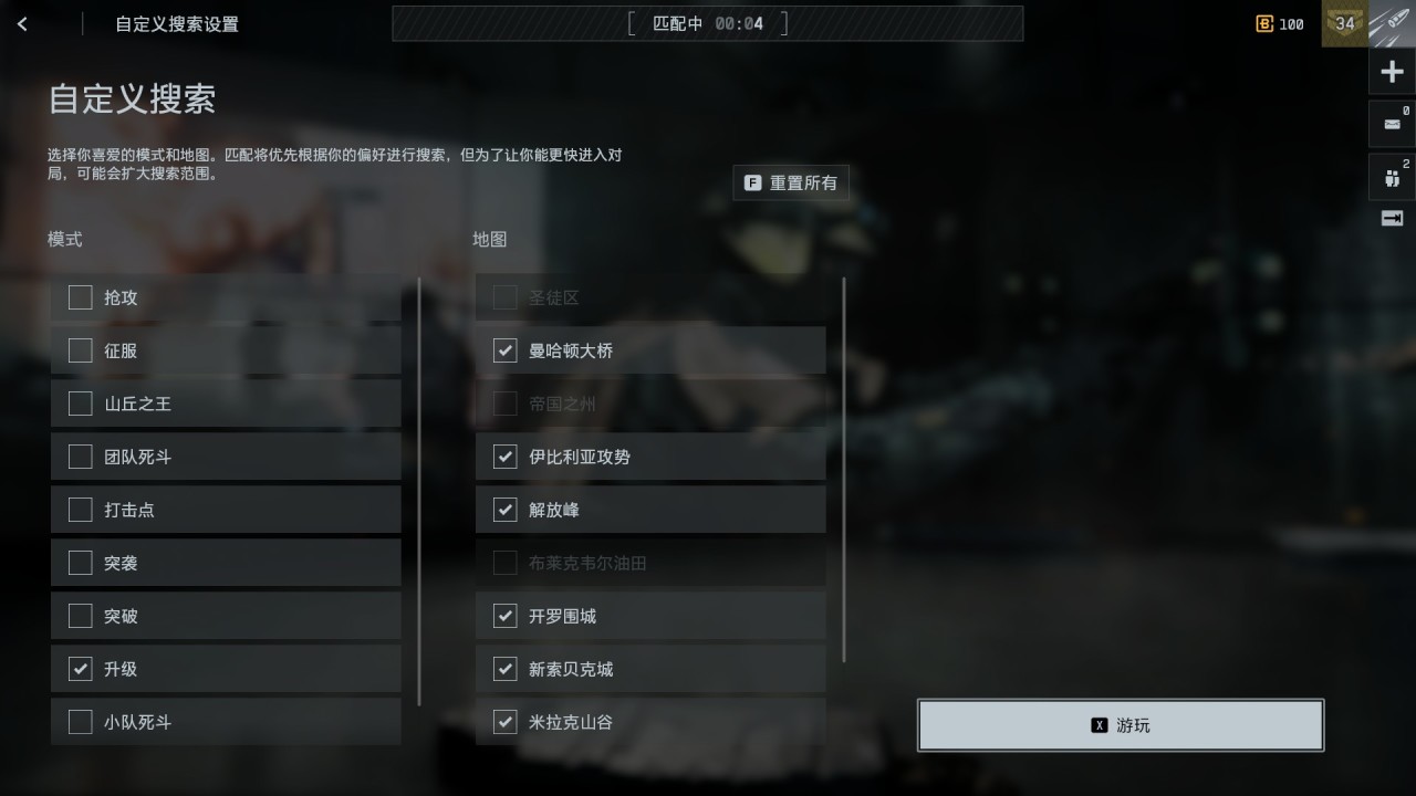 打開多人模式下的自定義搜索,然後把所有勾選掉,只留下升級模式就可以進入了。
