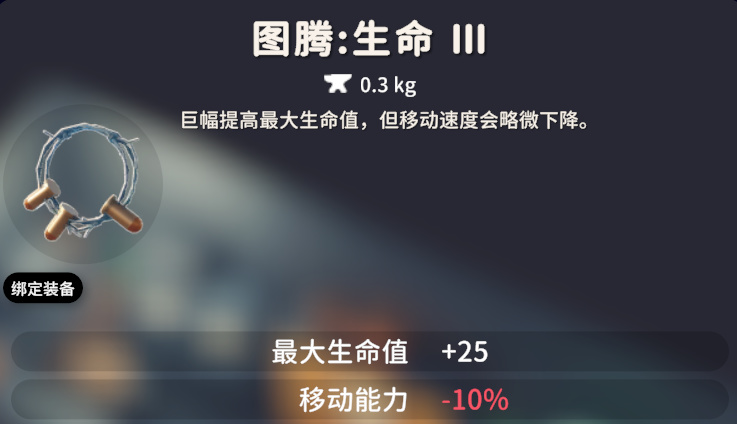 生命图腾一共有三个等级,效果依次是:生命Ⅰ,最大生命值 +8;生命Ⅱ,最大生命值 +15;生命Ⅲ:最大生命值 +25 移动能力 -10%。