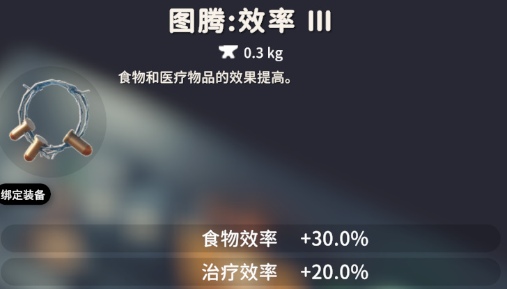 效率图腾一共有三个等级,效果依次是:效率Ⅰ,奔跑和行走速度 +7%;效率Ⅱ,治疗效率 +30%;效率Ⅲ:食物效率 +30% 治疗效率 +20%。