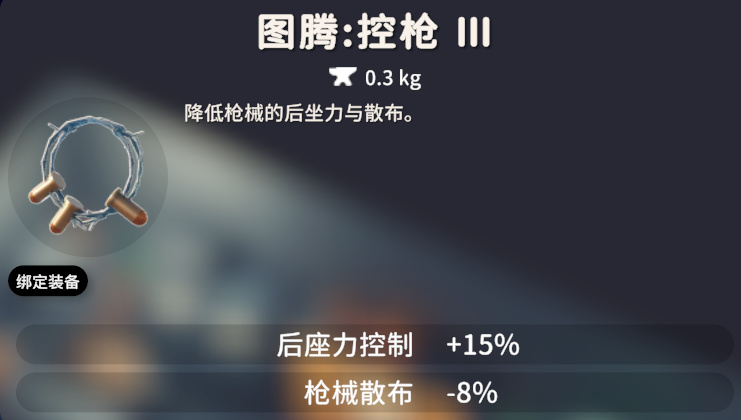 控枪图腾一共有三个等级,效果依次是:控枪Ⅰ,后坐力控制 +30% ;控枪Ⅱ,枪械散布 -15%; 控枪Ⅲ:后坐力控制 +15% 枪械散布 -8%。