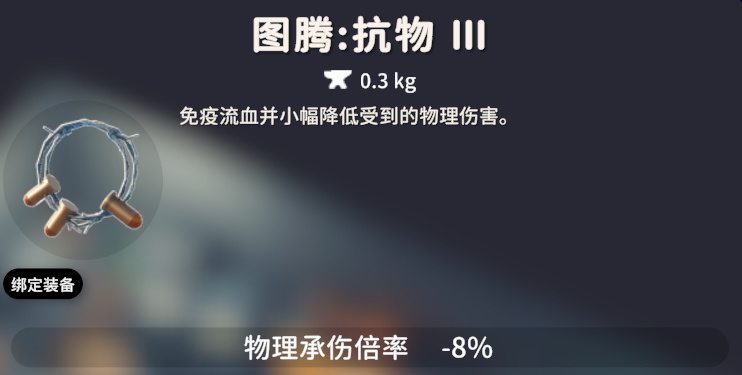 抗物图腾一共有三个等级,效果依次是:抗物Ⅰ,免疫流血;抗物Ⅱ,物理减伤 12%;抗物Ⅲ:免疫流血,物理承伤倍率- 8%。
