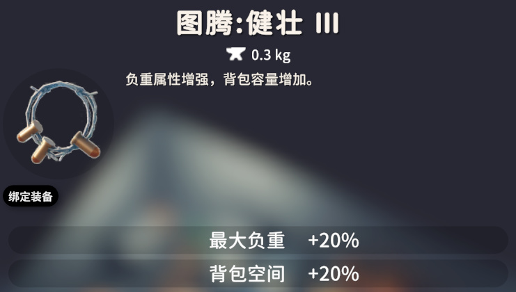健壮图腾一共有三个等级,效果依次是:健壮Ⅰ,最大负重 +25%;健壮Ⅱ,背包空间 +25%;健壮Ⅲ:背包空间和最大负重 +20%。