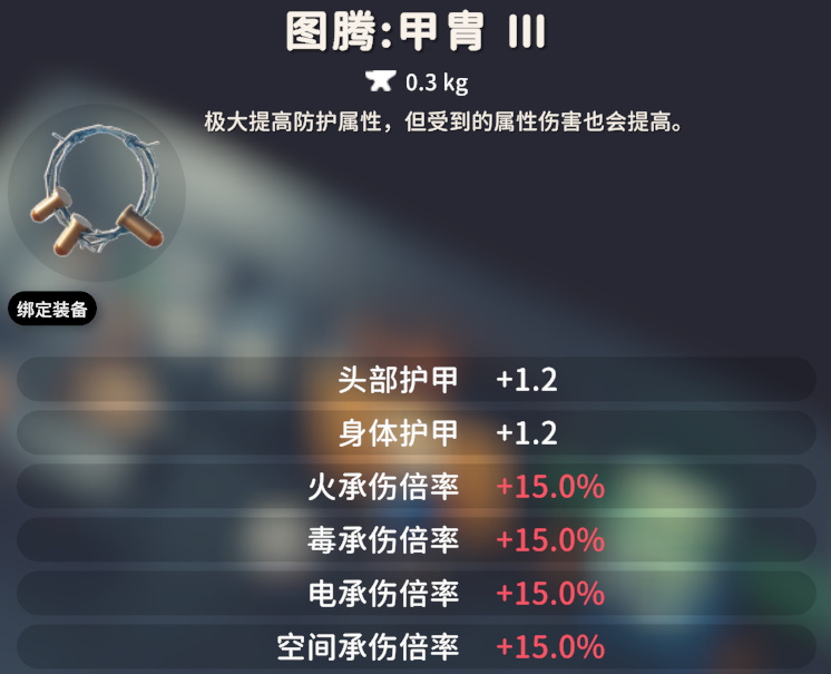甲胄图腾一共有三个等级,效果依次是:甲胄Ⅰ,头部、身体护甲各 +0.4;甲胄Ⅱ,头部、身体护甲各 +0.7;甲胄Ⅲ:头部、身体护甲各 +1.2,火、毒、电、空间承伤倍率 +15%。