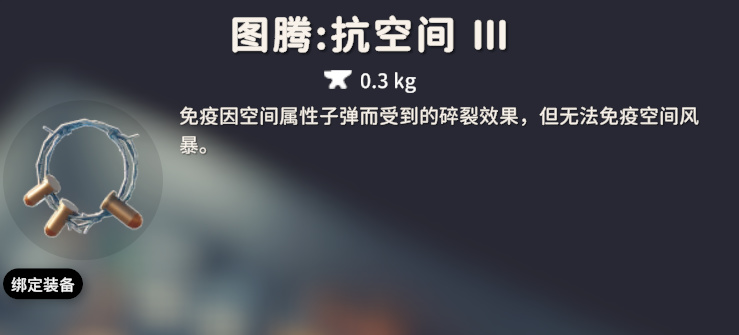 抗空间图腾一共有三个等级,效果依次是:抗空间Ⅰ,空间减伤 12%;抗空间Ⅱ,免疫因空间子弹导致的碎裂效果,但无法免疫空间风暴,最大生命值 -15;抗空间Ⅲ:免疫空间子弹导致的碎裂效果,但无法免疫空间风暴。