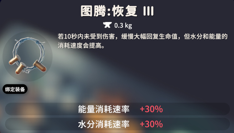 恢复图腾一共有三个等级,效果依次是:10秒未受伤后,每4.5秒回复1HP;恢复Ⅱ,10秒未受伤后,每2秒回复1HP;恢复:10秒未受伤后,每1秒回复1HP,增加食物和水分消耗速率30%。