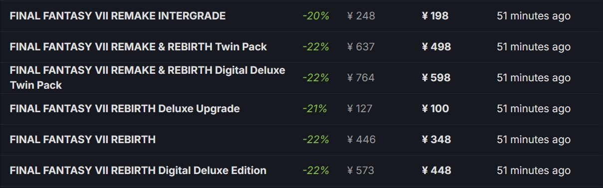 《最终幻想7:重制版》《最终幻想7:重生》国区价格永降。