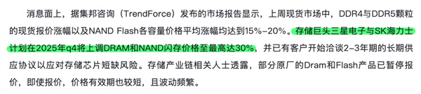 而且涨幅还非常夸张,目前的消息是三星和海力士在第四季度已经把存储价格上调了 30% 。