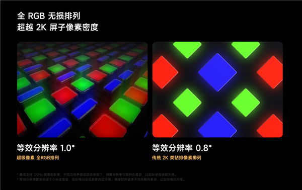 屏幕虽说没上 2K ,打脸了红米之前“无 2K 、不旗舰”的口号,但是由于用了 RGB 像素排列,等效 PPI 和钻石像素排列的 2K 屏其实是差不多的,实际观感属于同一水平。