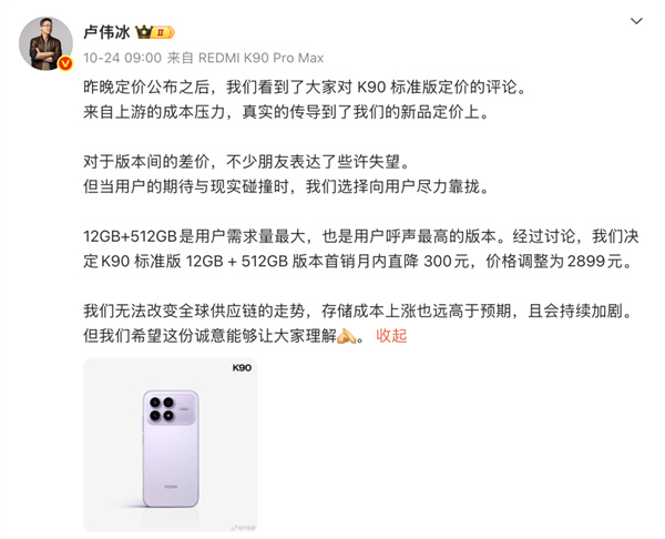 看到大家的不满后,卢伟冰也是连夜说服高管,决定在 K90 的 12GB+512GB 版本在首销期内下调为 2899 元,跟去年维持同价。
