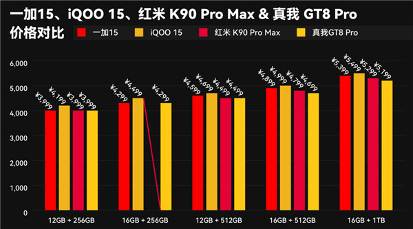 你们看,12GB+256GB 这个版本,无论是红米、一加还是 iQOO 都选择 2599 元起售,价格拉不开差距。