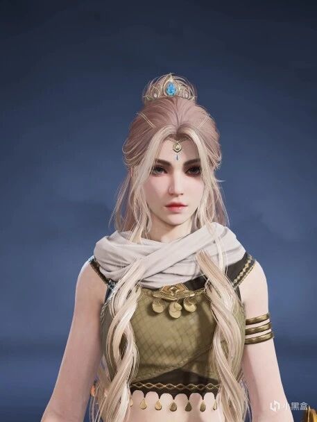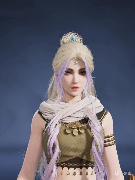 額間翠綠髮飾彰顯她高貴的身份,高高束起的髮髻更添一絲端莊。