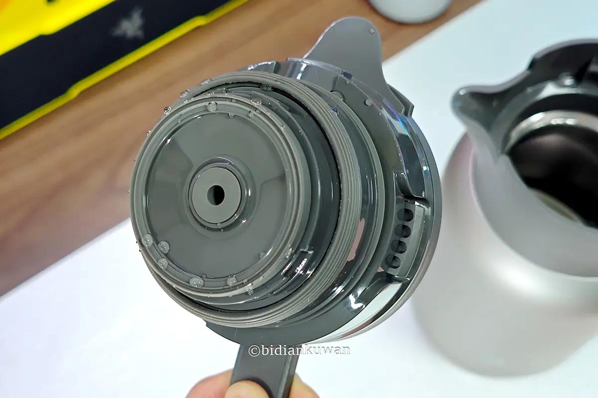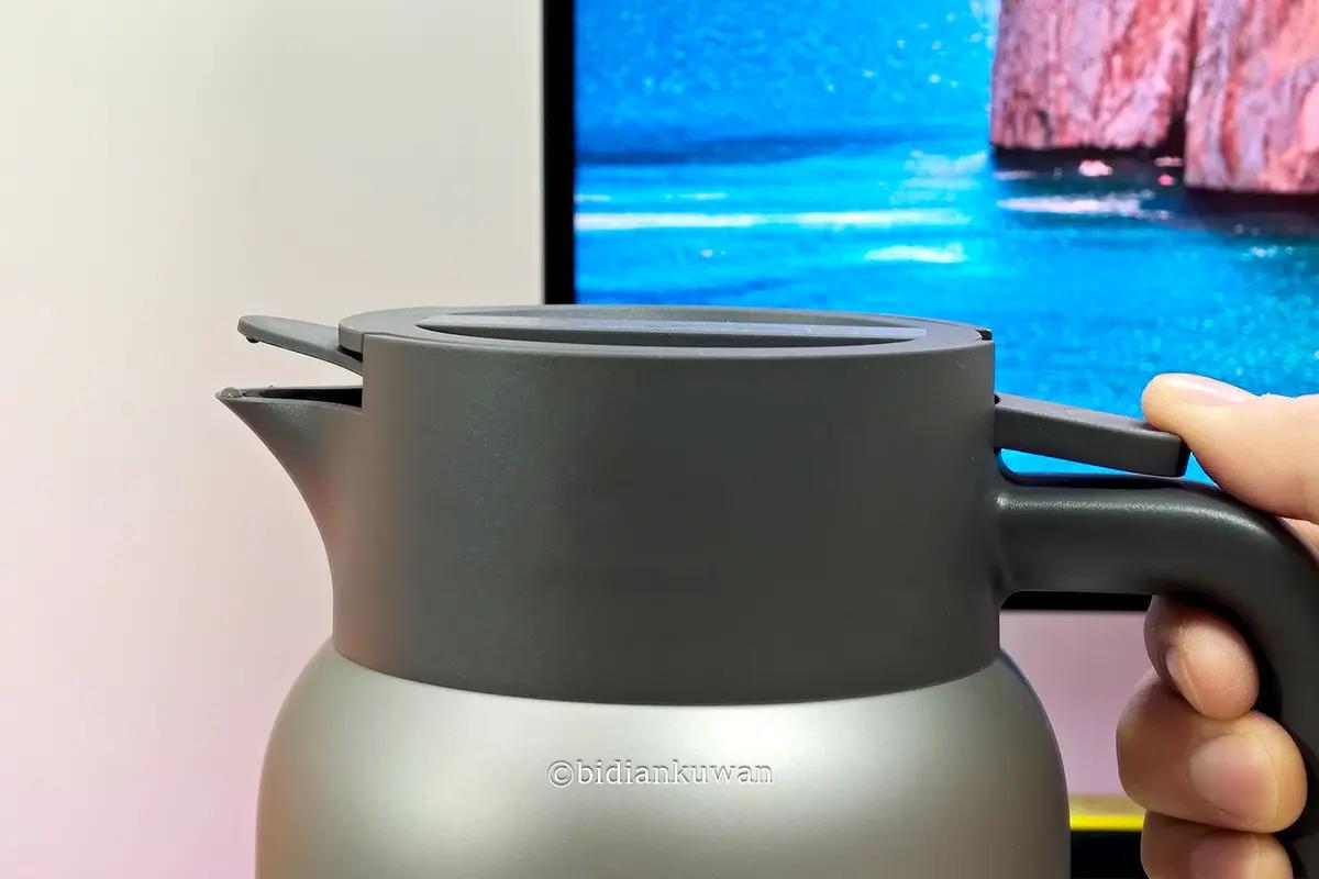 第三个值得注意之处,是钛保温壶1.2L的双泄压安全结构+喙状壶嘴与防尘设计。前者可以保证开盖或倒水时壶体内外压力自动平衡,不会出现热水和蒸汽意外喷溅出来的情况。